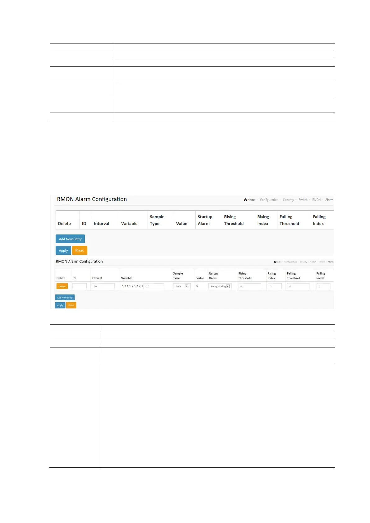 This page configures the RMON Alarm table. The entry index key is ID.