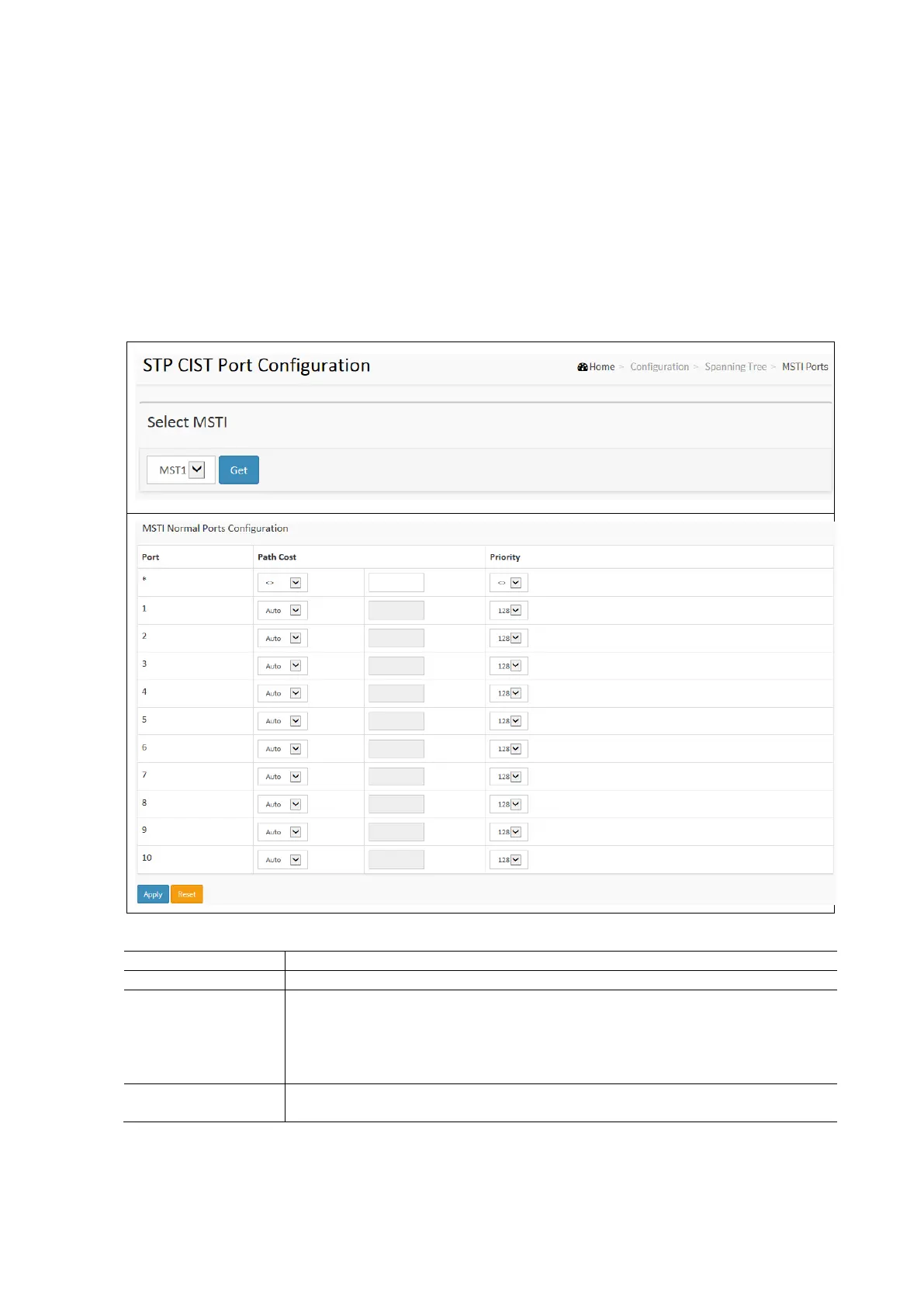 Click “Get” to set the parameters of the MSTI Ports including Path Cost and Priority.