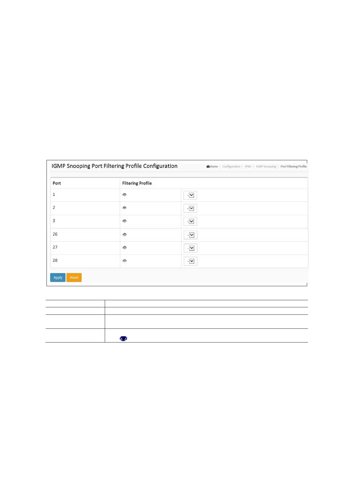 IGMP Snooping Port Filtering Configuration Parameters: