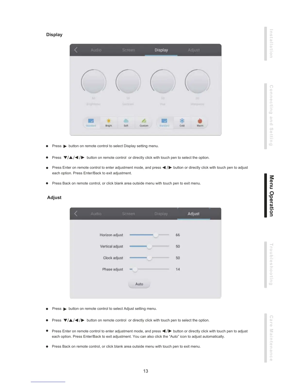 Press Enter on remote control to enter adjustment mode, and press button or directly click with touch pen to adjust