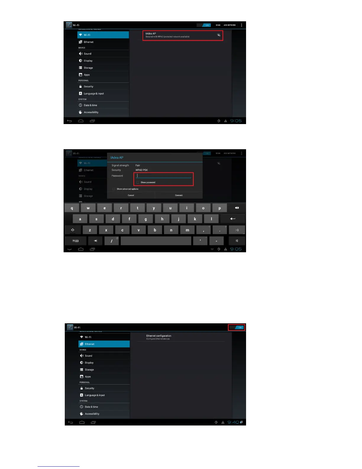 To use the wired Ethernet connection, connect an Ethernet cable and disable the Wireless LAN interface first