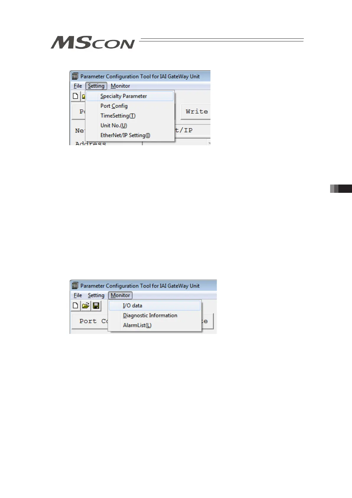 • I/O data : Show the details of the host PLC and MSCON data.