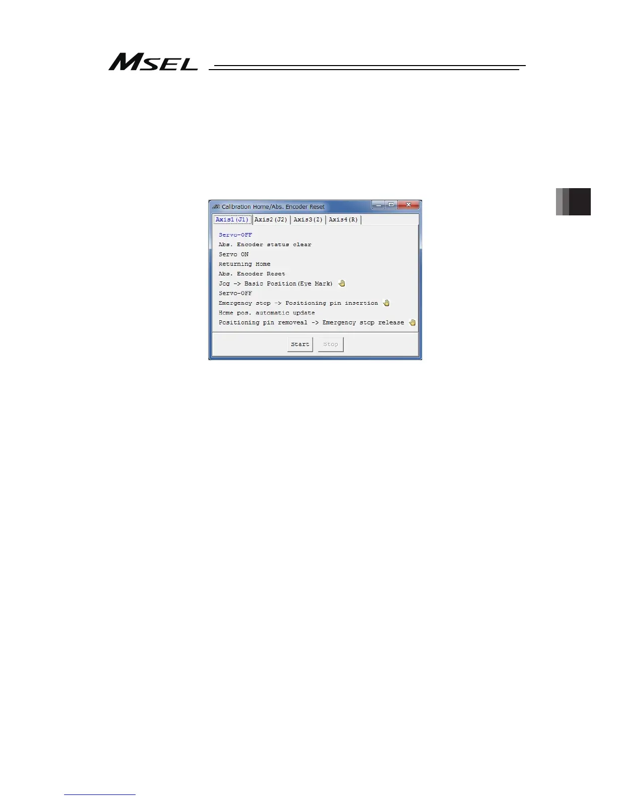 5) “Calibration Home/Abs. Encoder Reset” appears. Select the tab for the axis that requires