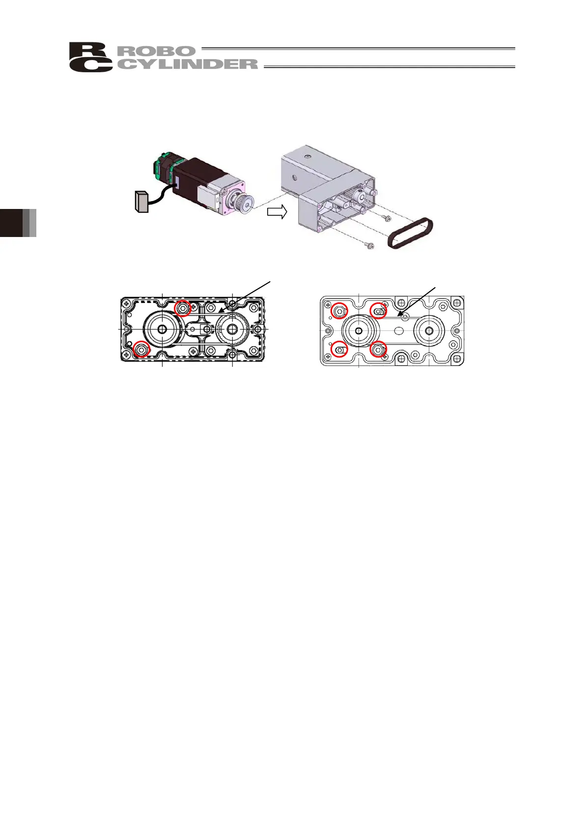 7) Install the new motor and temporarily tighten the tension adjustment bolts (encircled parts).