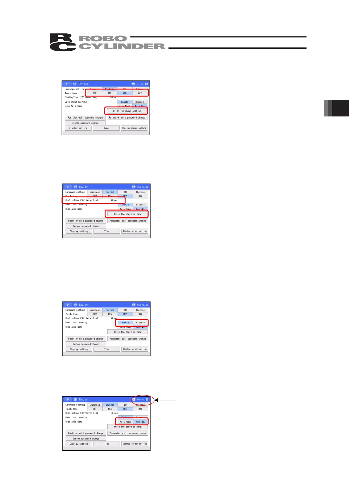 Touching [DimDispTime (“0”: Never Dim) 0 sec] displays