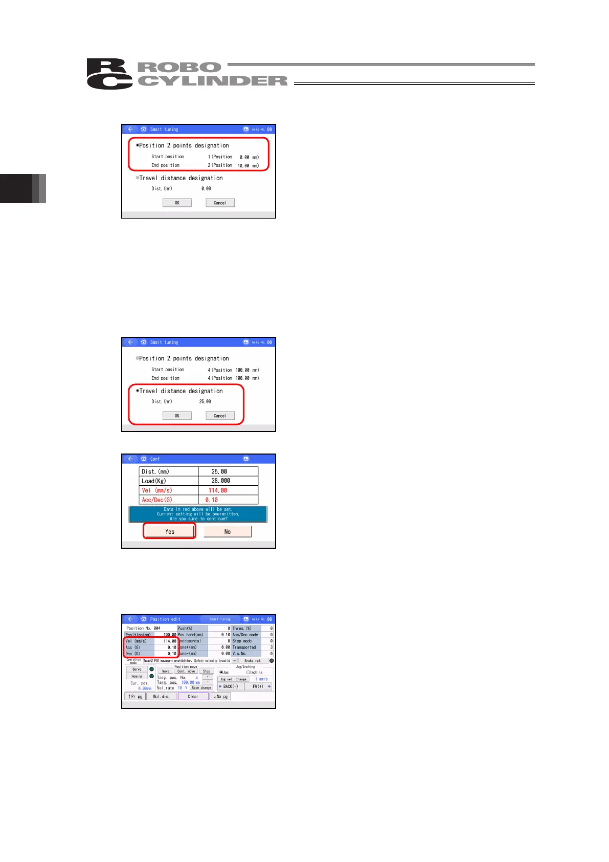 3) The velocity, acceleration and deceleration are set to provide the shortest tact time to run