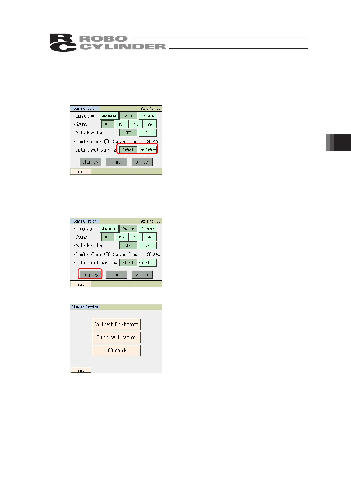 Adjustment of contrast and brightness of the screen, position tuning for touch panel and LCD