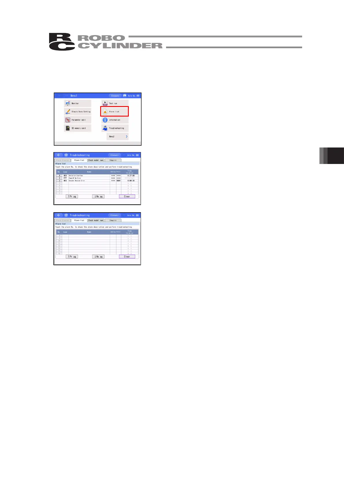 Touching [Clear] clears all alarm details.