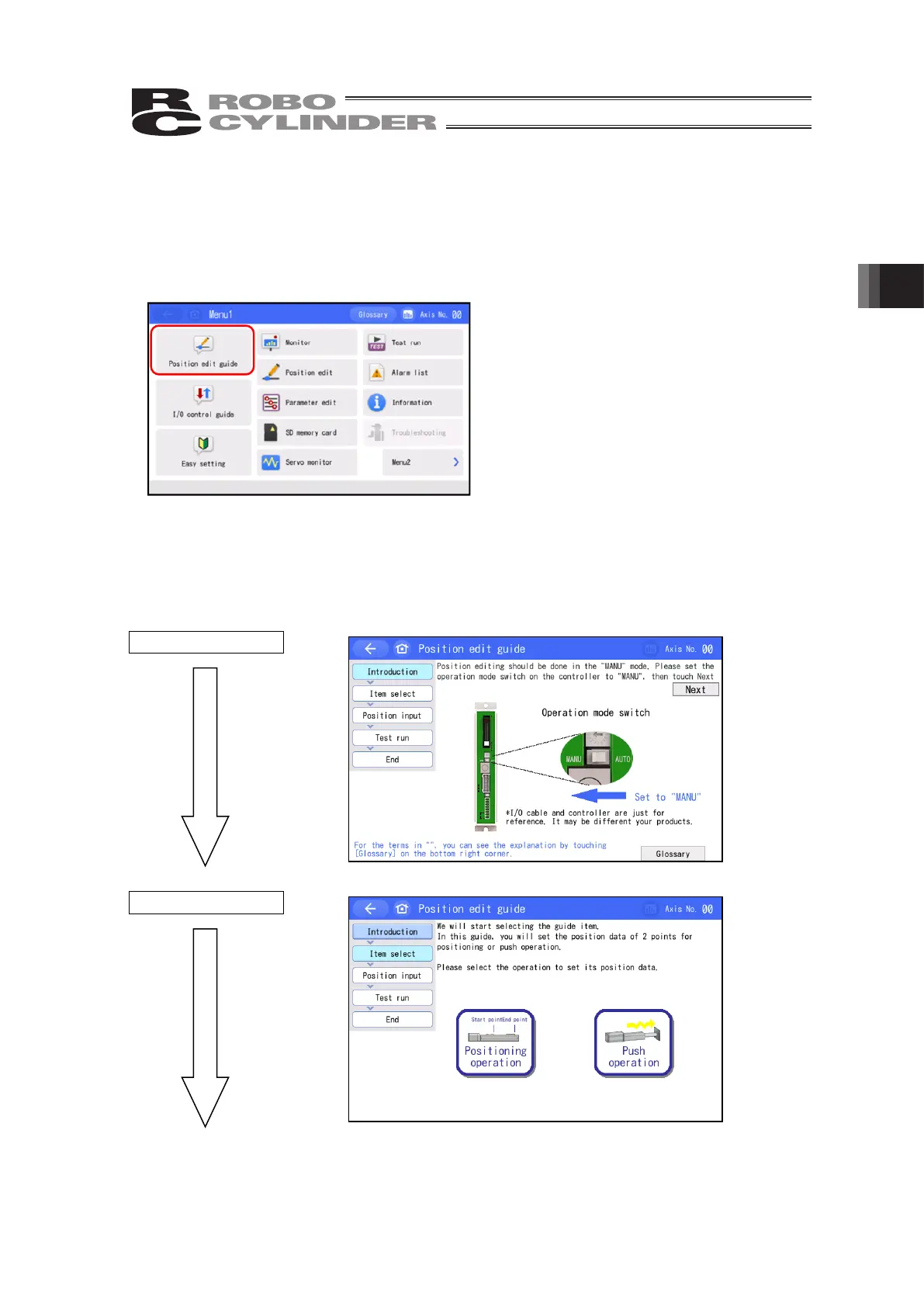 Operate in the order of [Introduction] → [Item select] → [Position input] → [Test run] → [End].