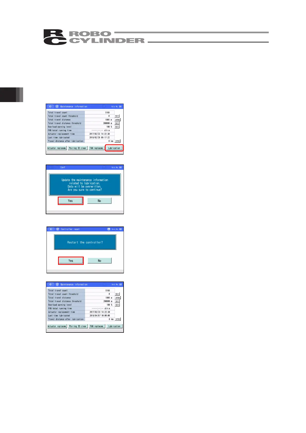 Shown below is how to record the time of lubrication and how to reset the drive distance after