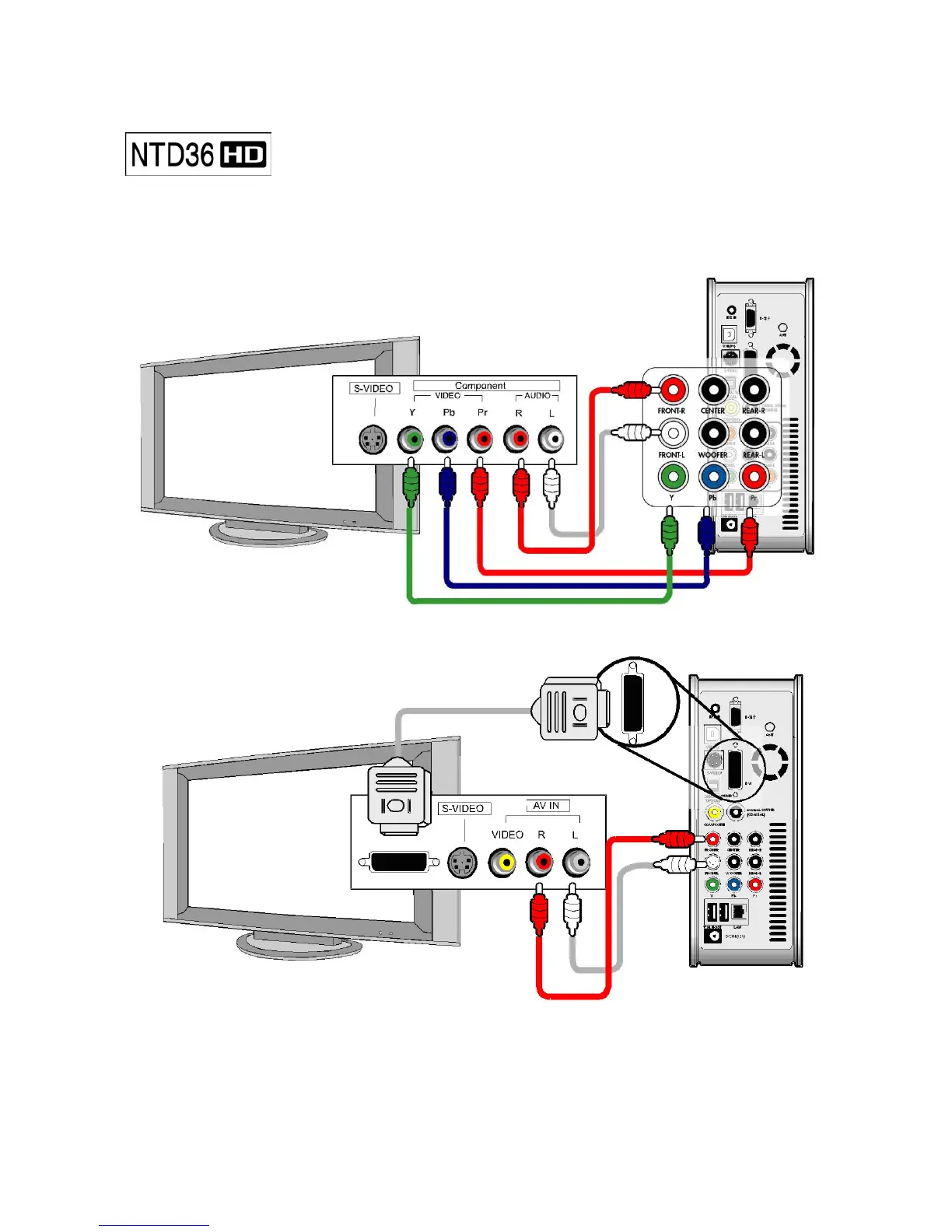• For safety, connect cables after power off NTD36HD, TV and audio system.