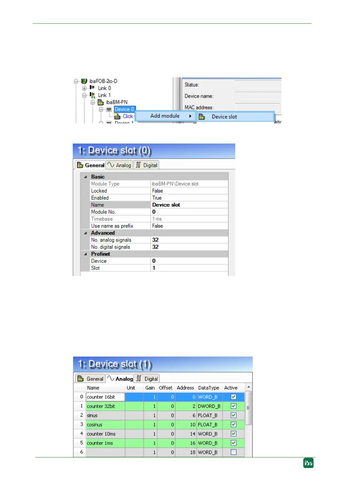 ibaBM-PN device and select "Add module" and the module "Device slot“ from the list.