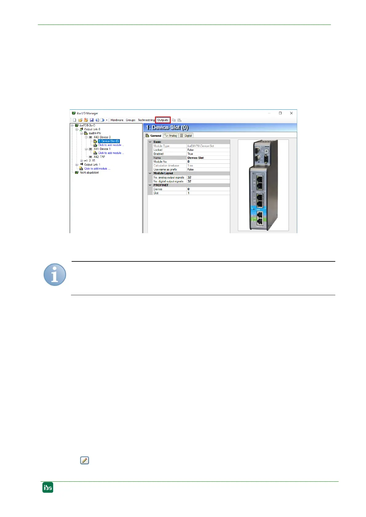 For configuring the outputs, select the "Outputs" tab in the I/O Manager. Modules which