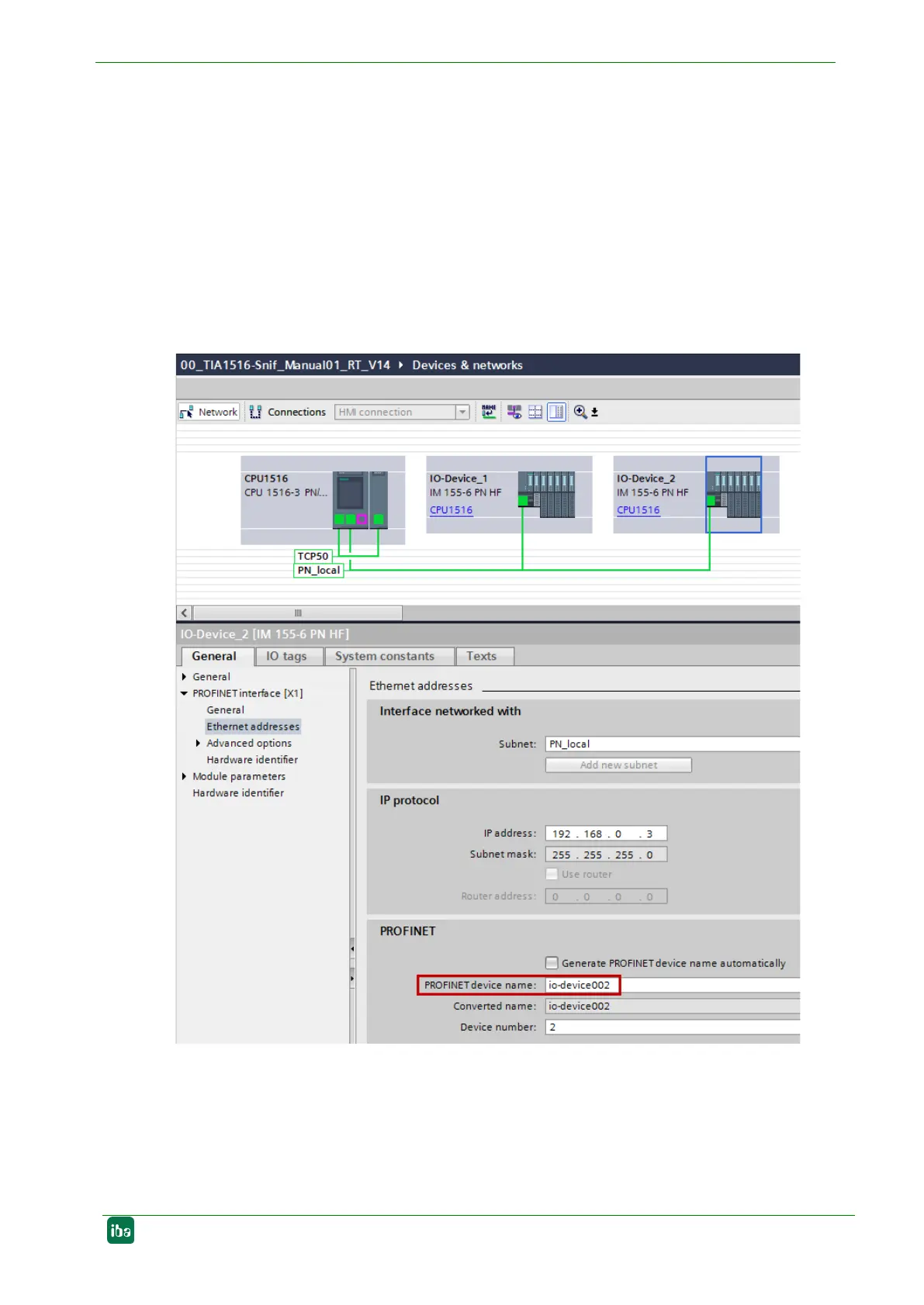 The ibaBM-PN device is not configured and integrated in the PROFINET line between