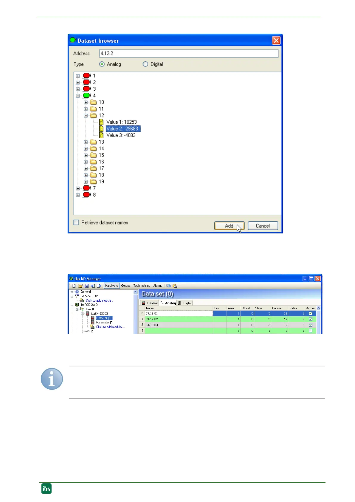 Analog or Digital tab. Node number (slave), data set number and index are entered