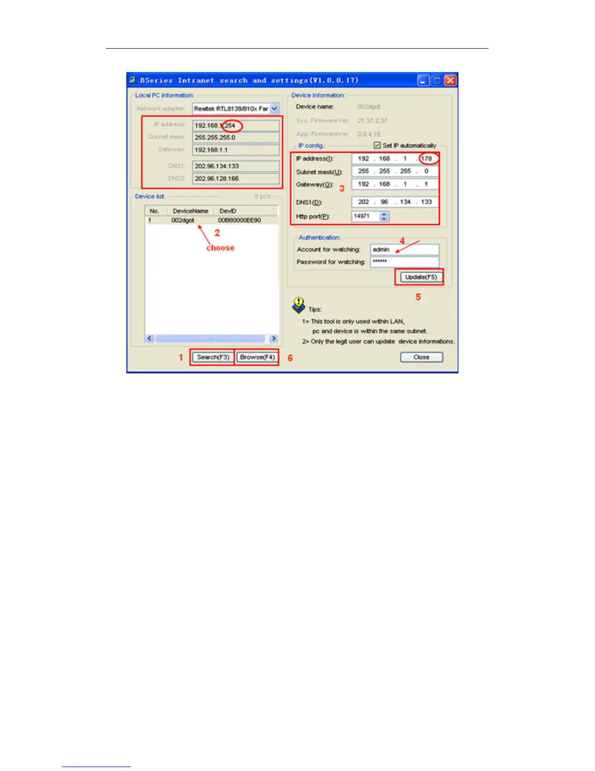 6) Click “Search (F3)”, choose the device, and then click “Browse (F4)”. You will be