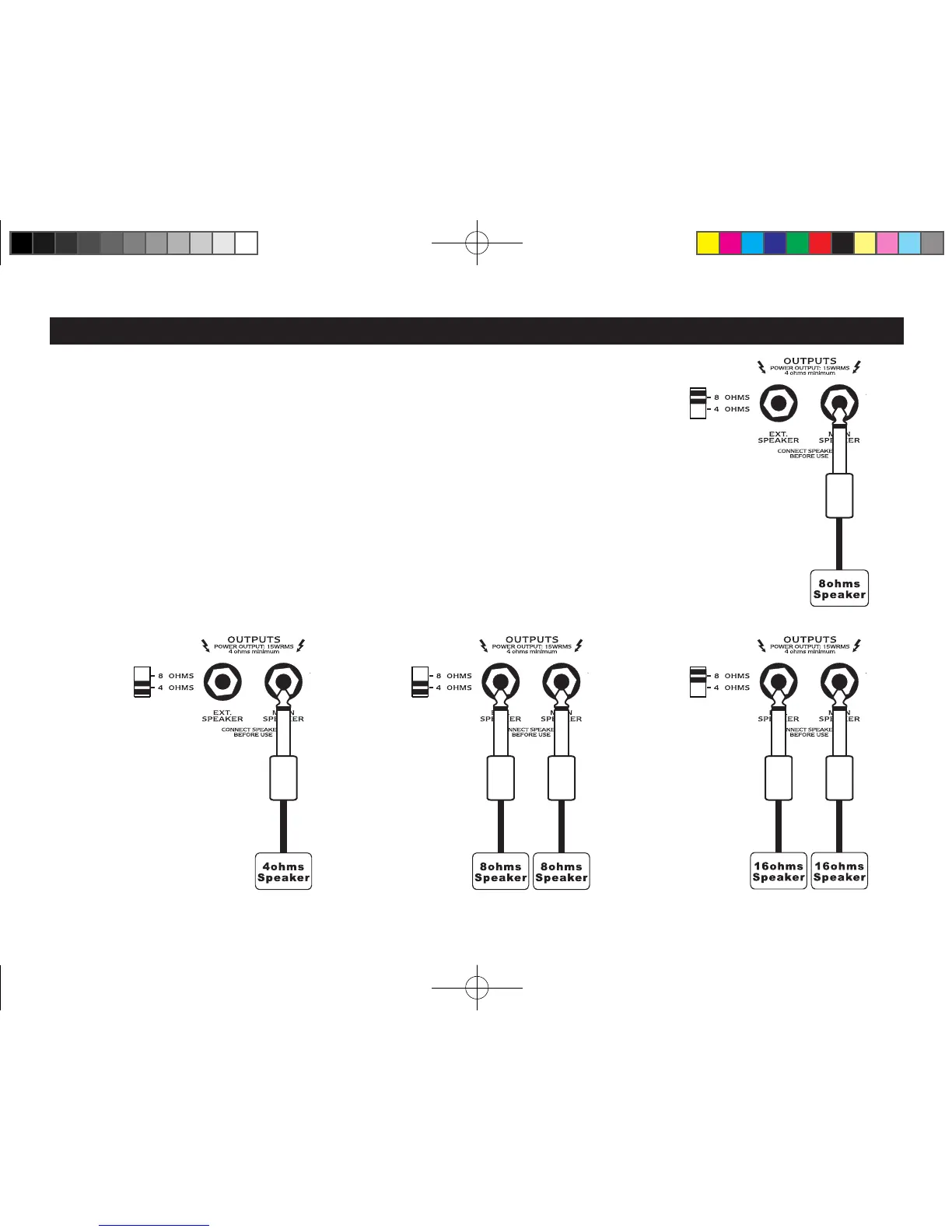 ※スピーカ・キャビネットの接続と、スピーカの抵抗値の選択は本製品の電源をオンにする前に行ってください。スピーカ・ケー