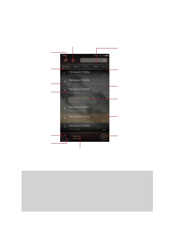 iBasso DX220 - Music Screen Navigation; Detail and Directory Views; Search Bar Functionality; Navigation Bar and Management