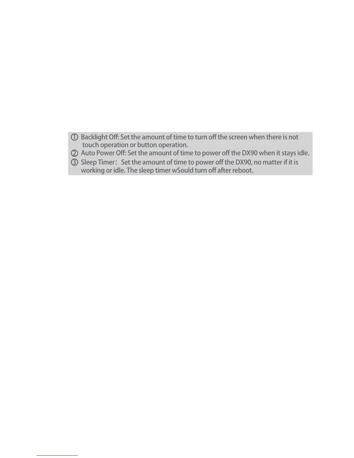 Sleep Timer:Set the amount of time to power off the DX90, no matter if it is