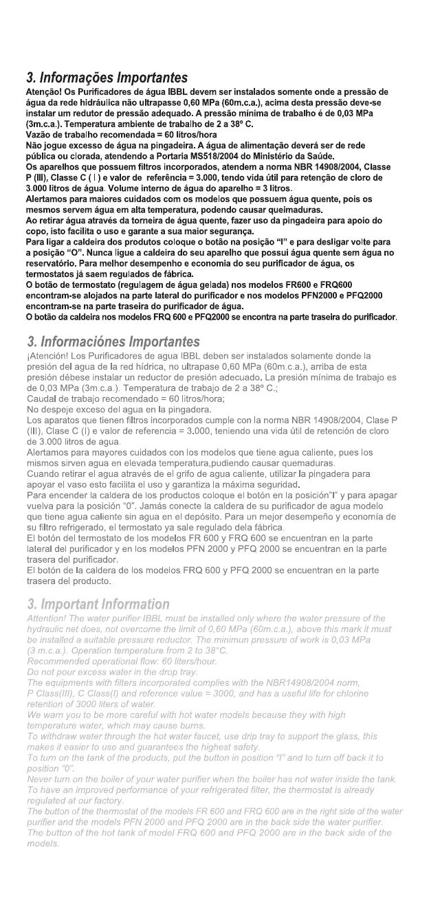 IBBL FR-600 - 3. Important Information; Water Pressure and Temperature Limits; Recommended Operational Flow; Water Source Requirements