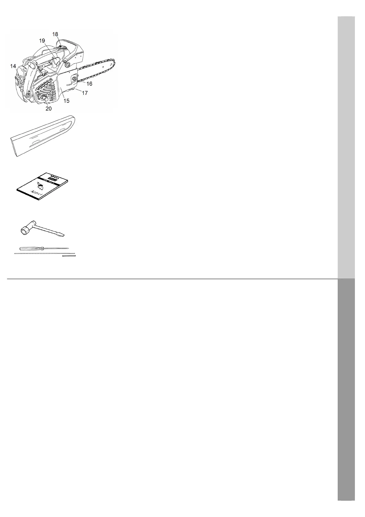 15.Carter de chaîne : Couvercle de protection du guide-chaîne, de la chaîne, de l’embrayage et du pignon lorsque la scie à chaîne