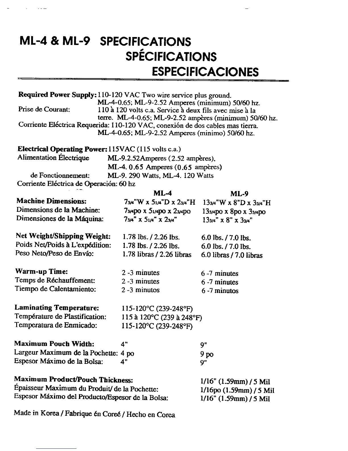 ibico ML-4 - ML-4 & ML-9 Specifications; Required Power Supply; Machine Dimensions; Warm-up Time