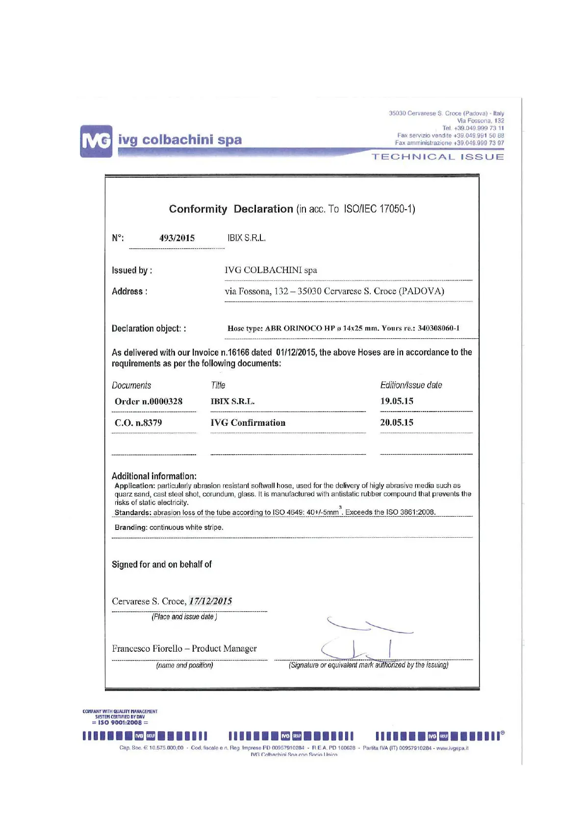 IBIX 25 - Conformity Declaration N.493 ABR ORINOCO HP 14 X25