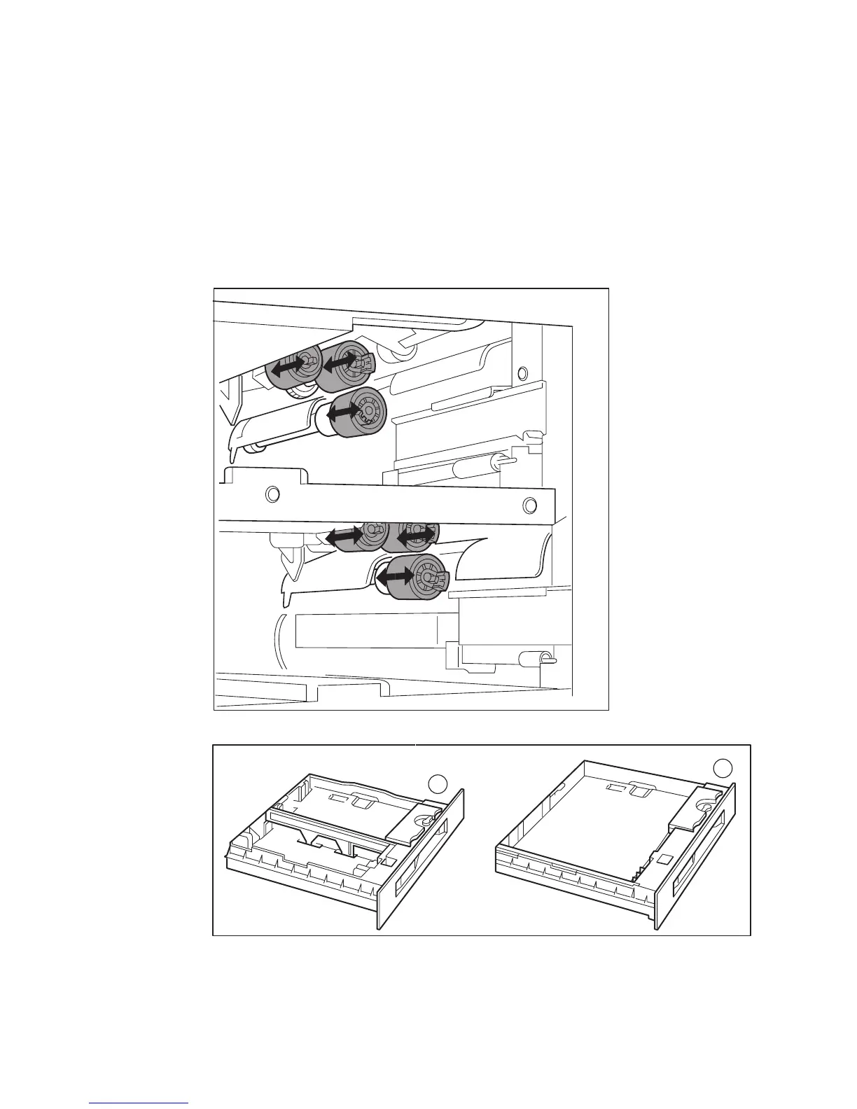 20. Overlap paper tray 1 guide rail arrow (1) on the track arrow (2).