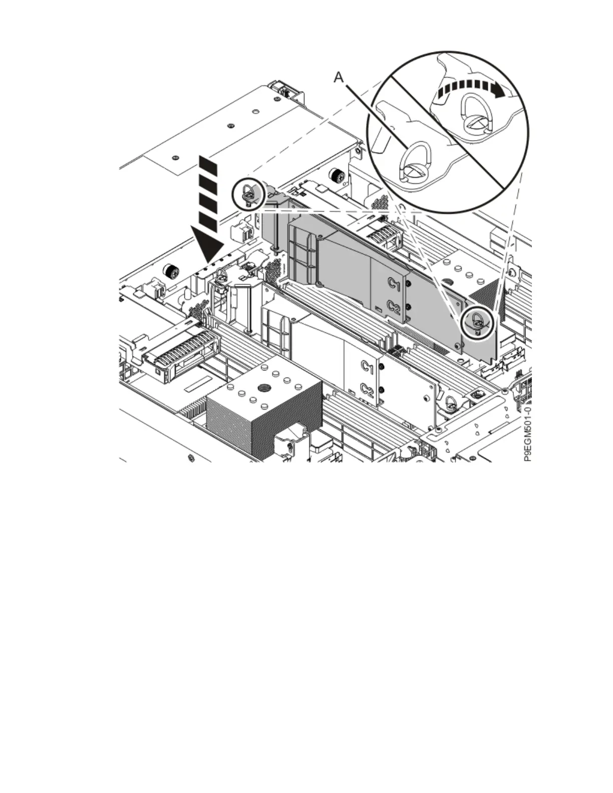 the SAS RAID adapter down to seat the adapter. Push in and twist the screws (A) clockwise to