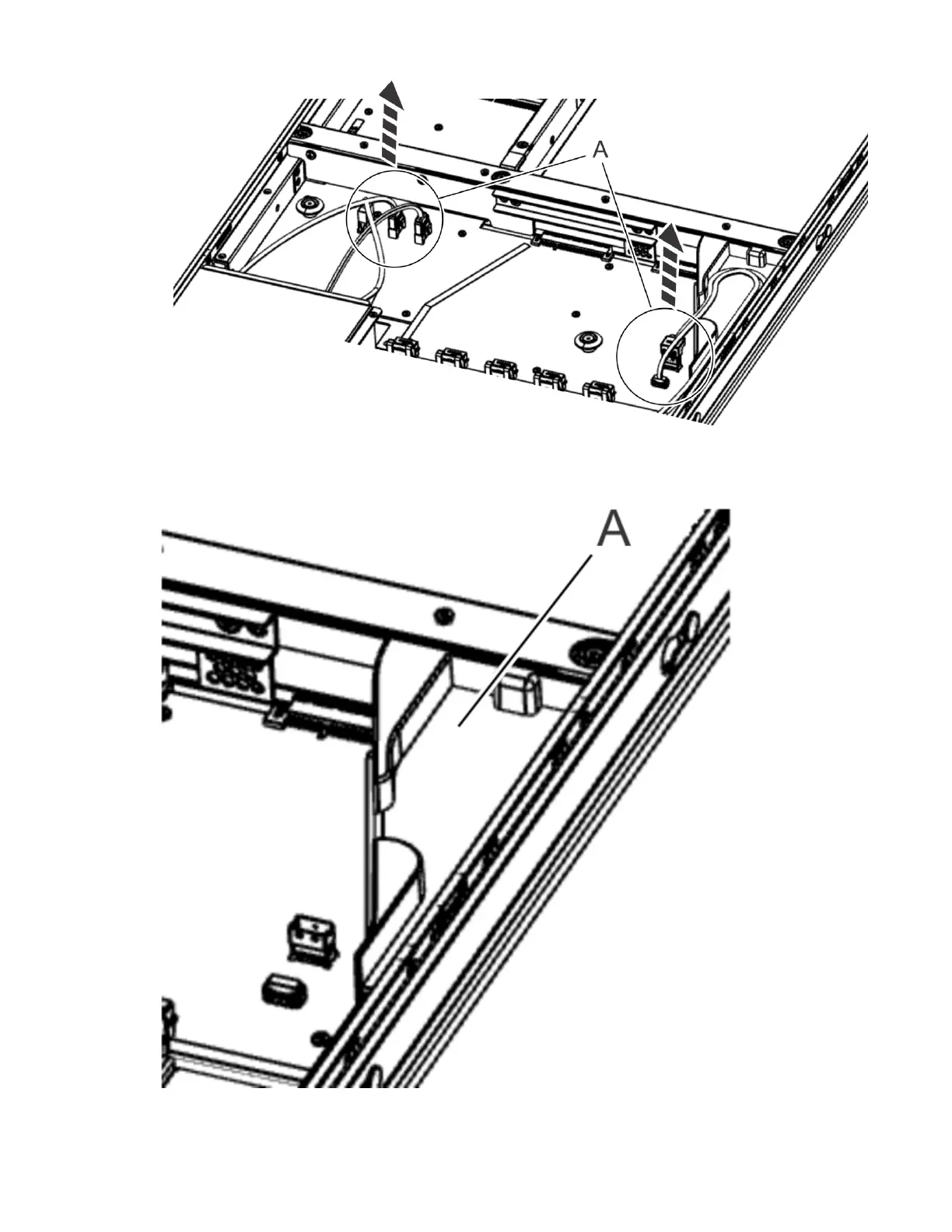 8. Remove the right plastic air baffle (A) from the right edge of the system; lift it straight up.
