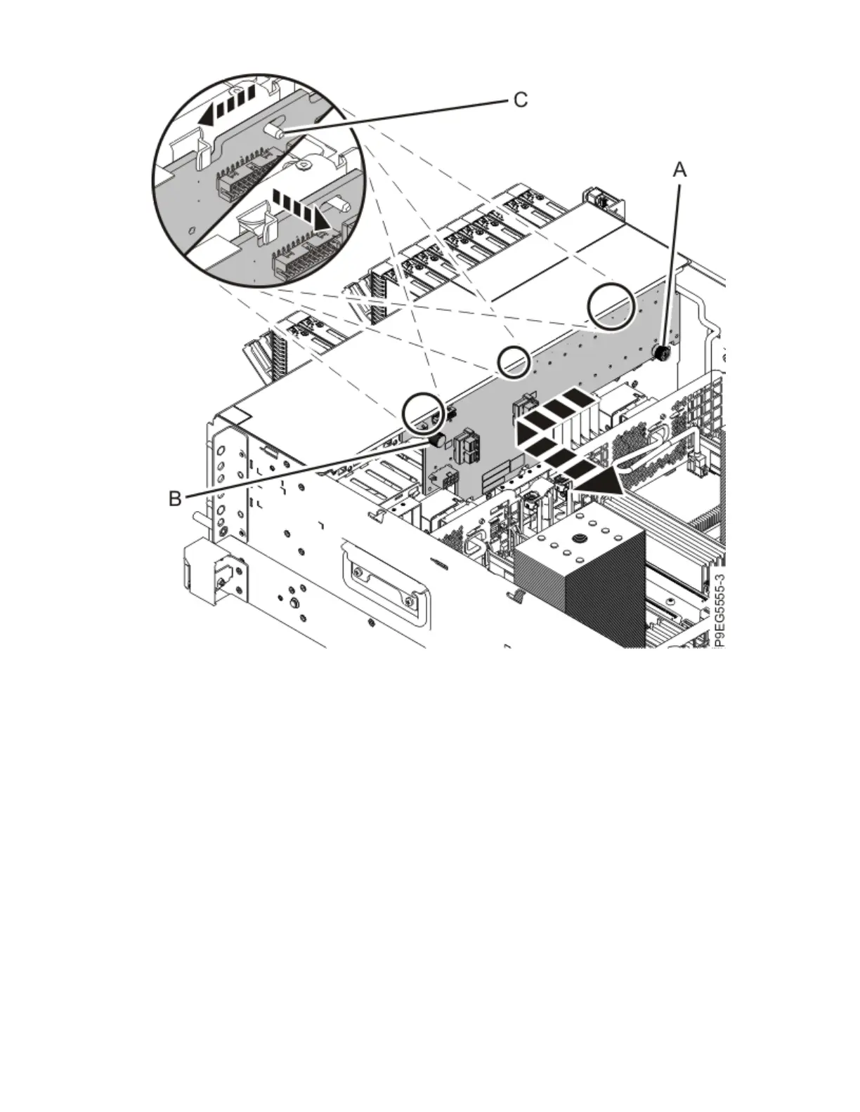 Slide the disk drive backplane to the side in the direction that is shown so that the disk drive backplane