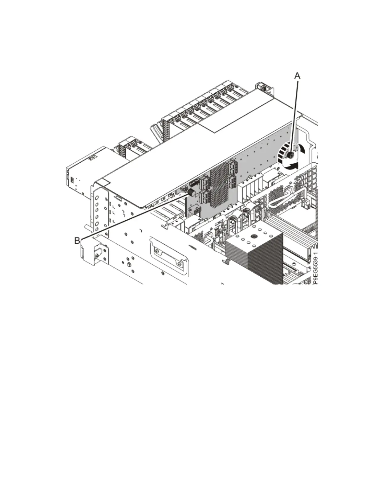 10. Using the thumbscrew (A) and the disk drive backplane holder (B), slide the disk drive backplane to