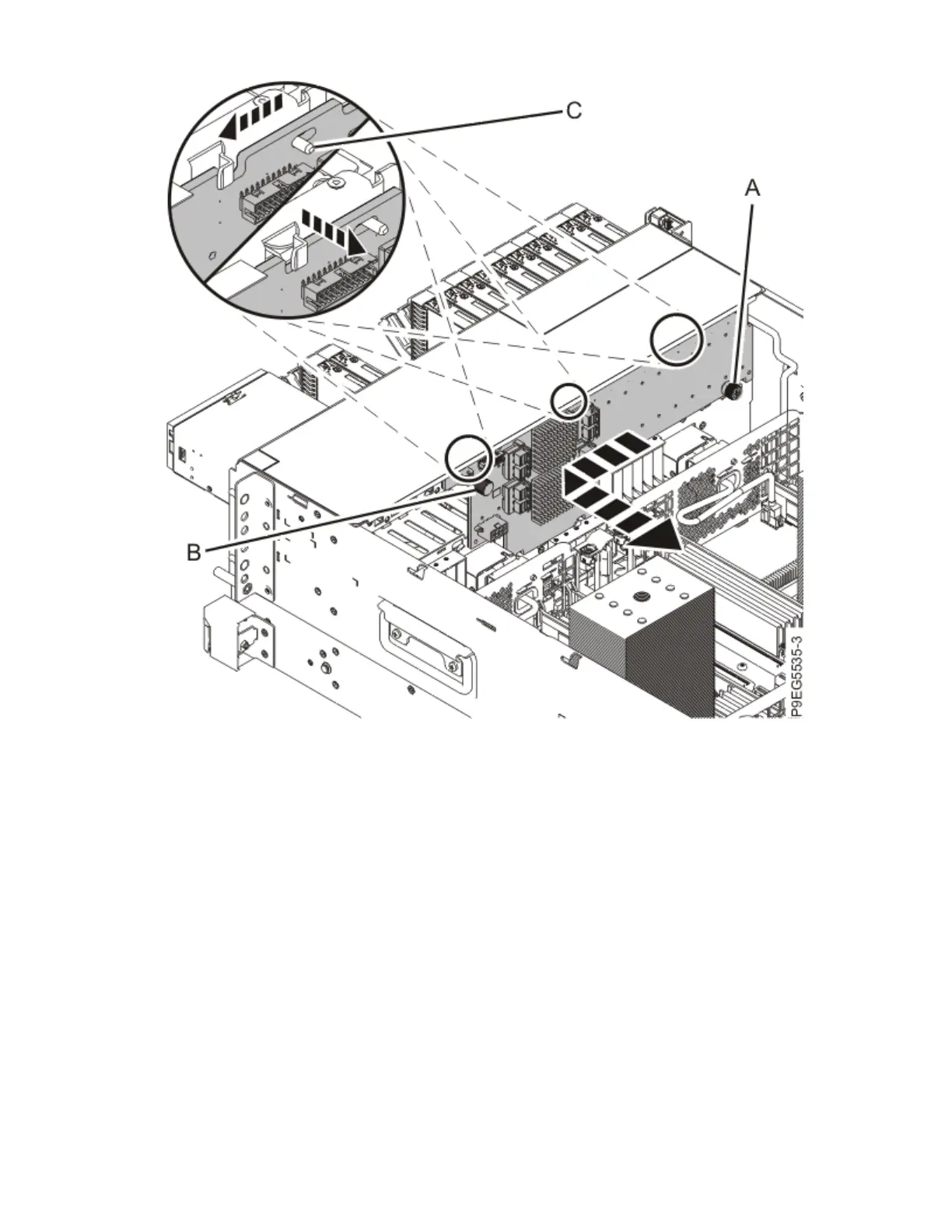 Slide the disk drive backplane to the side in the direction that is shown so that the disk drive backplane