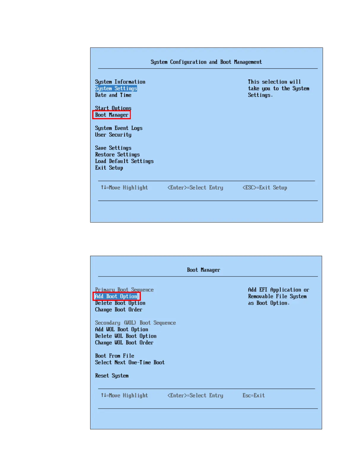3. On the Boot Manager menu, select Add Boot Option, as shown in Figure 4 on page 389.