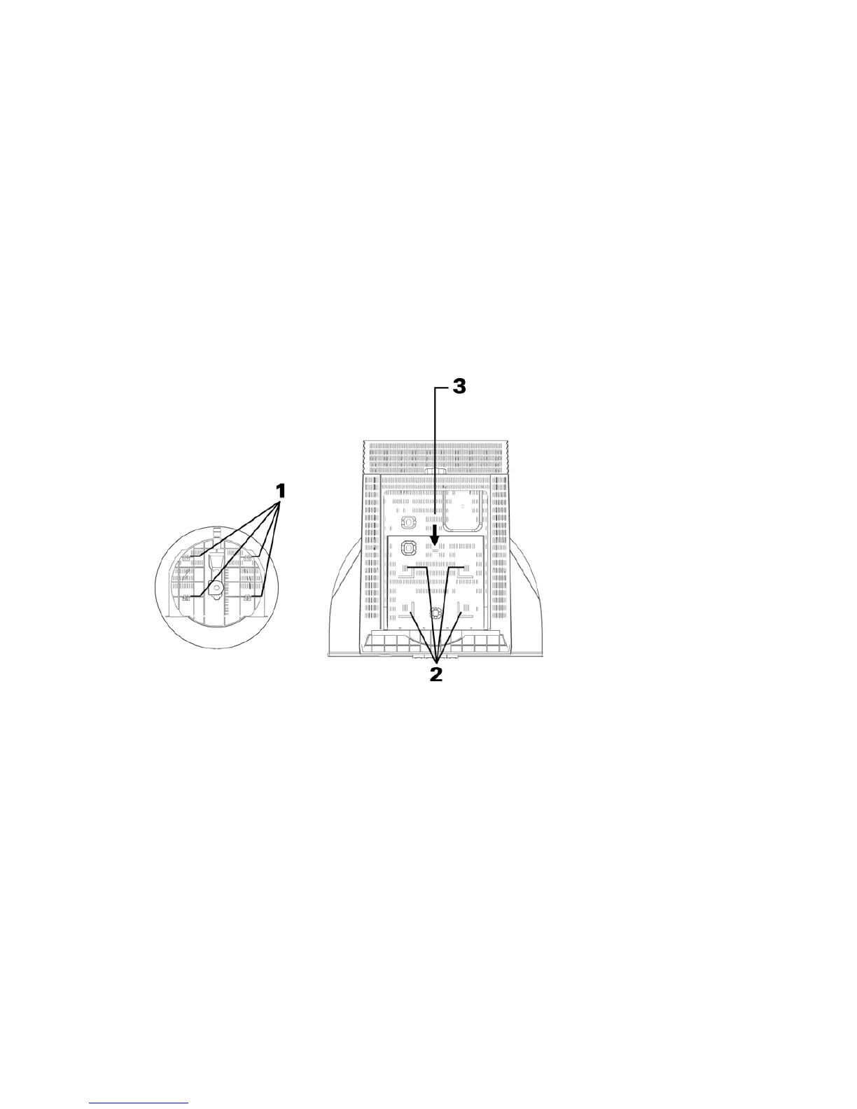 2. Insert the hook (1) into the matching slots on the underside of the monitor (2).