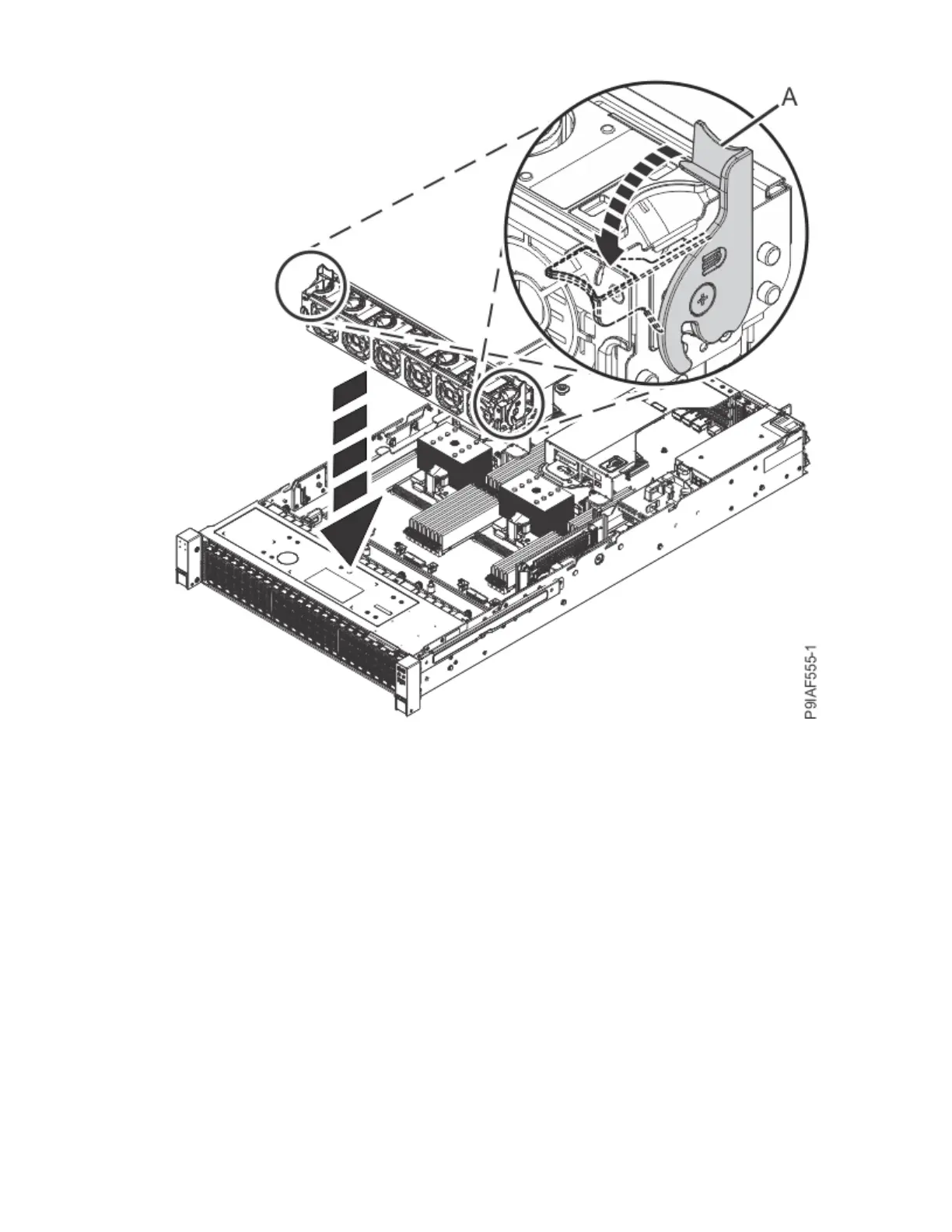 4. Replace the air baffle (A) straight down into the chassis as shown in the following gure.