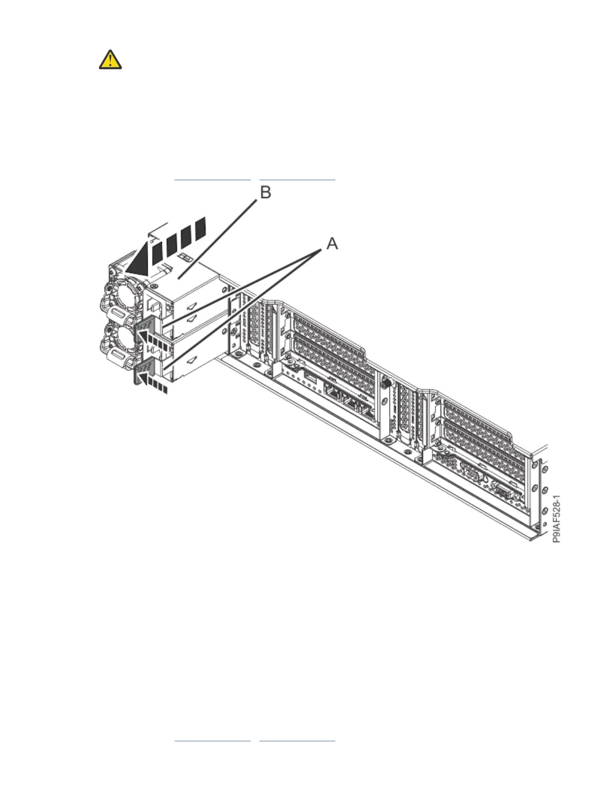 c) Slide the power supply into the system until the latch (B) locks in place.