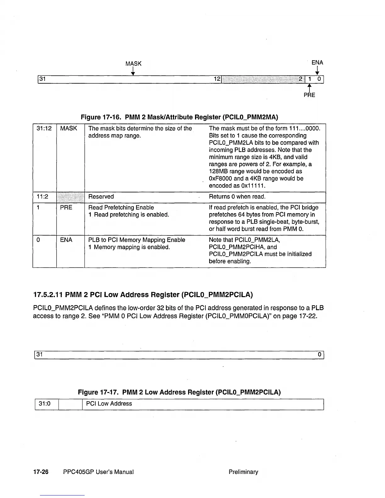 See "PMM 0 PCI Low Address Register (PCILO_PMMOPCILA)" on page 17-22.
