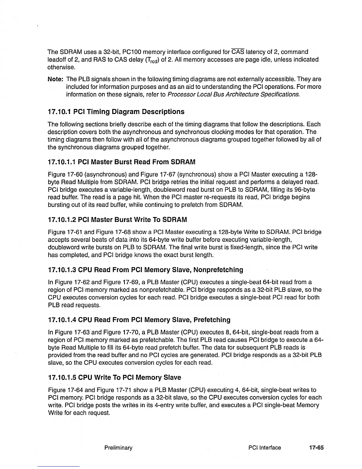 Figure 17-61 and Figure 17-68 show a PCI Master executing a 128-byte Write to SDRAM. PCI bridge