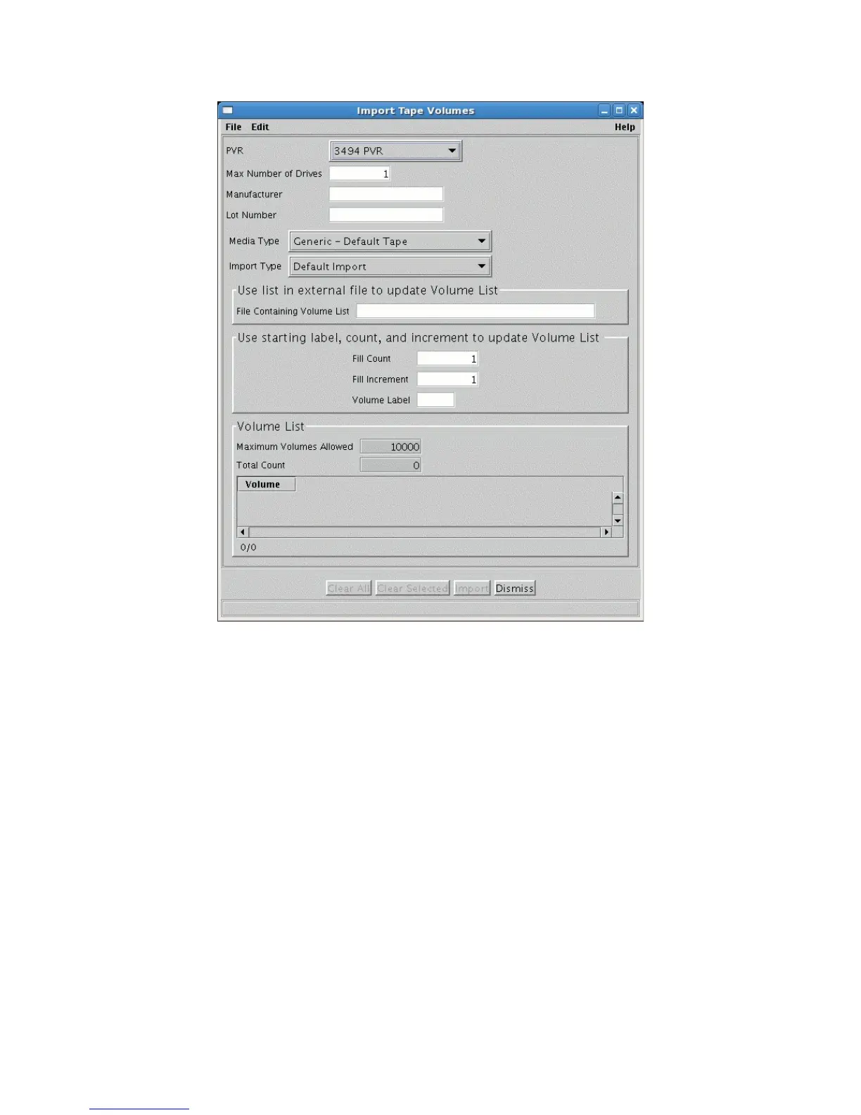 This window allows the user to import tape volumes into the HPSS system, making them known to the