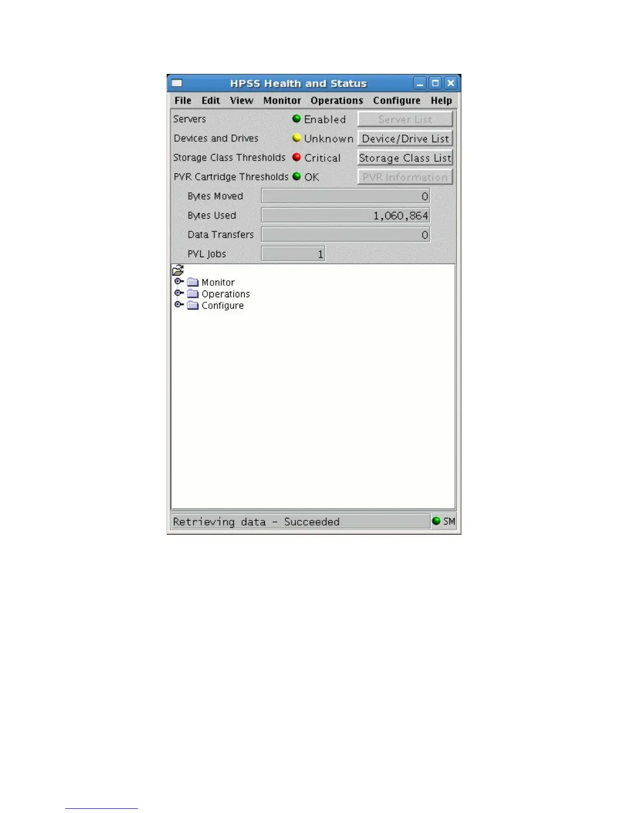 The HPSS Health and Status window is composed of several high-level components, each of which is