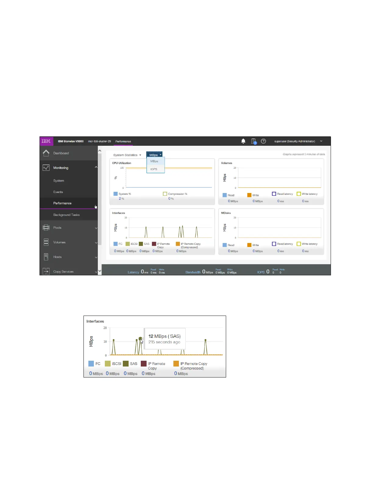 use, host and internal interfaces, volumes, and MDisks. You can switch between MBps or