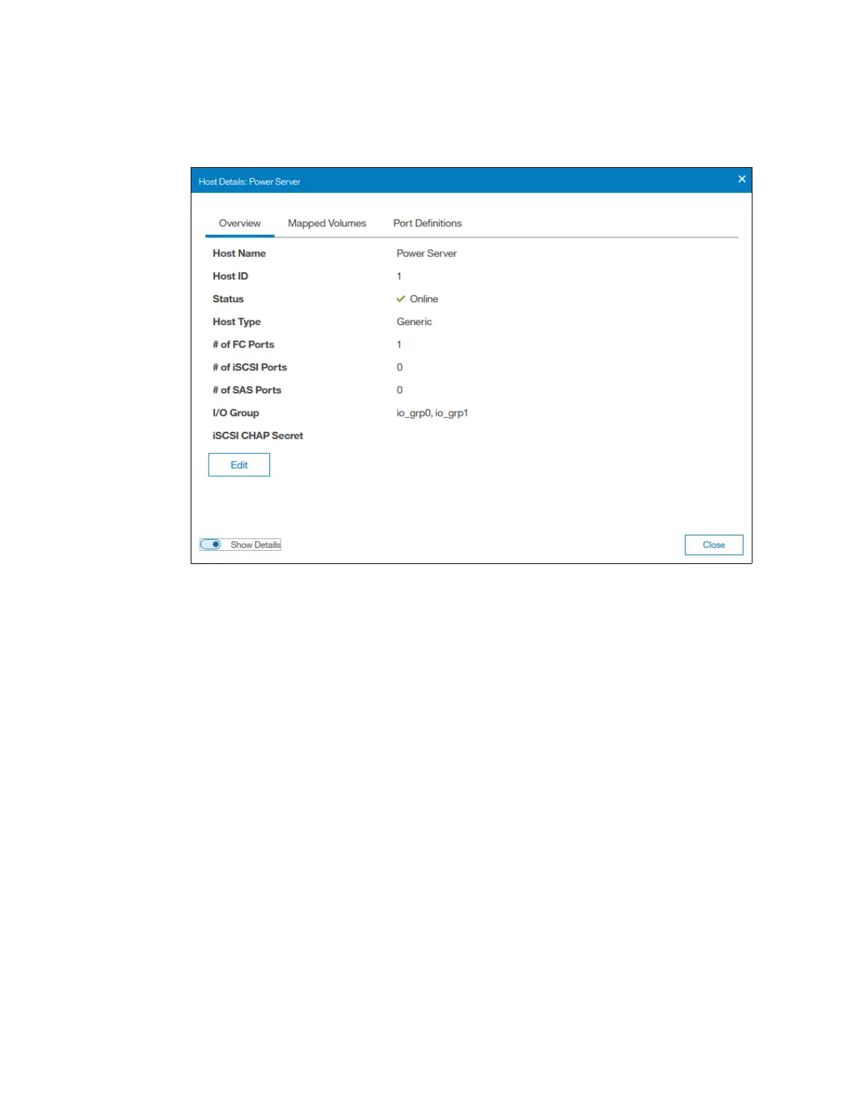 With enabled details, you can modify host name, host type, I/O group assignment, or iSCSI