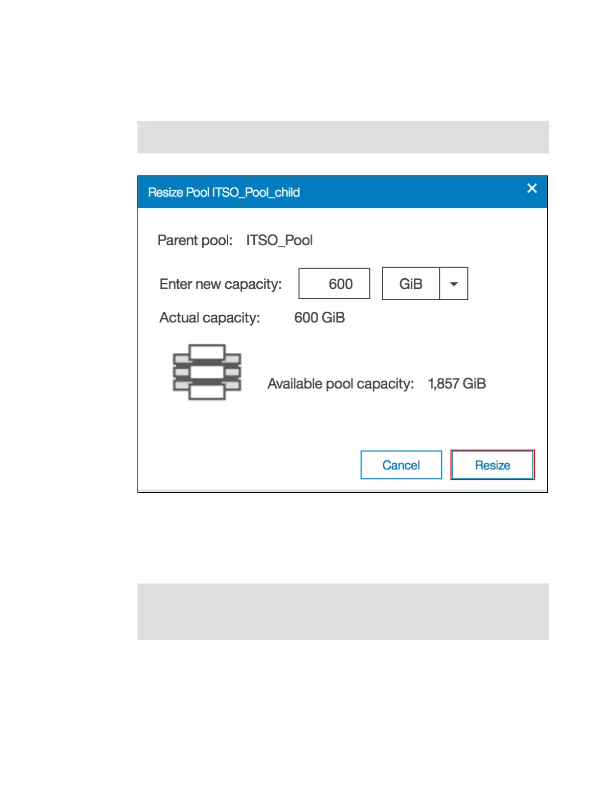 Selecting Resize allows you to increase or decrease the capacity of the child storage pool, as