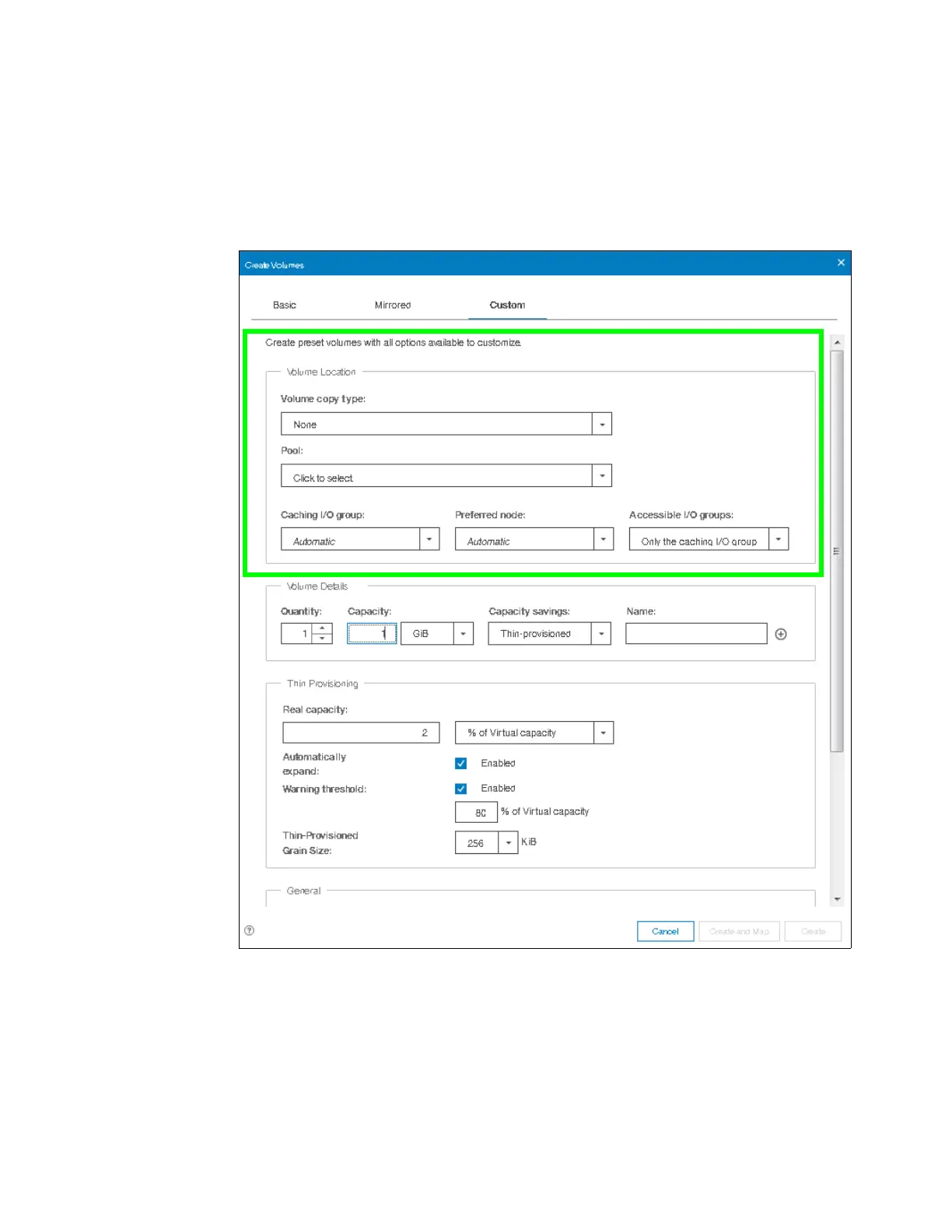 1. From the Create Volumes window, select the Custom option. In the Volume Location
