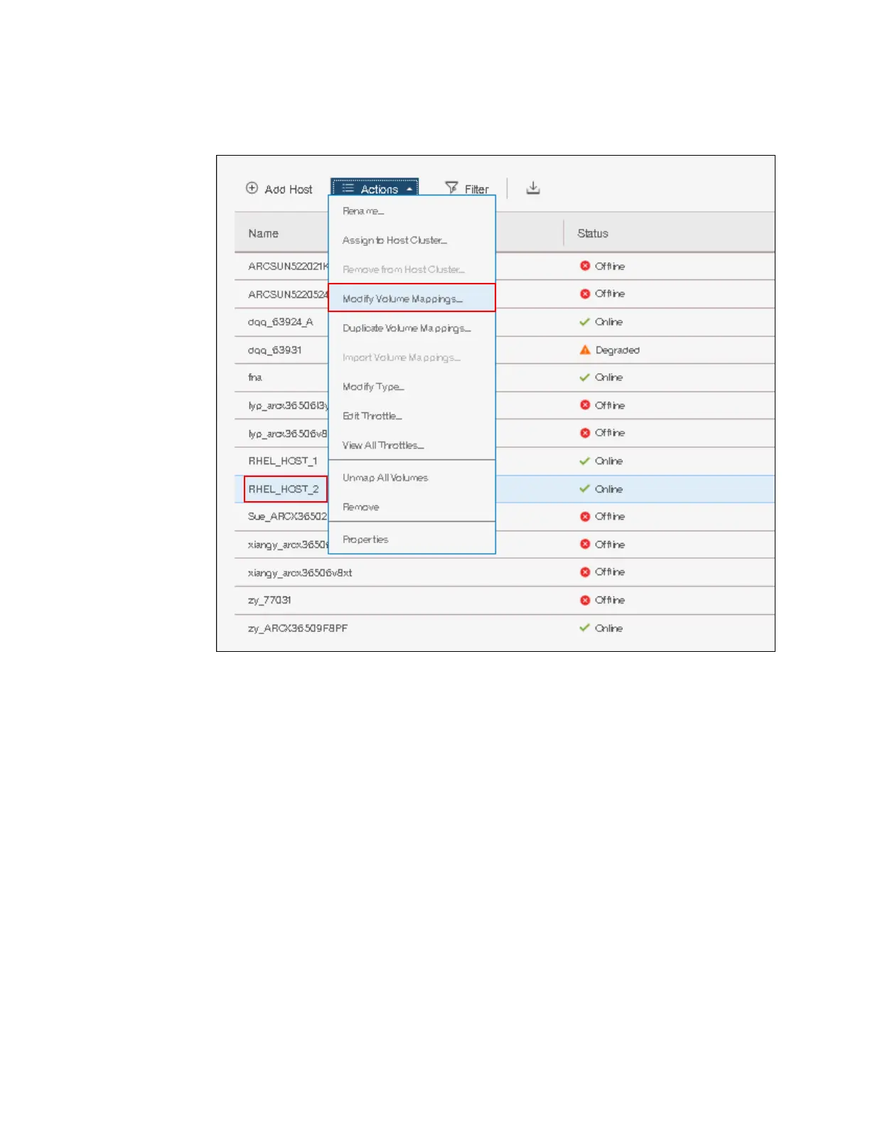 2. From the right hand side pane, select the host for which you want to unmap a volume, and