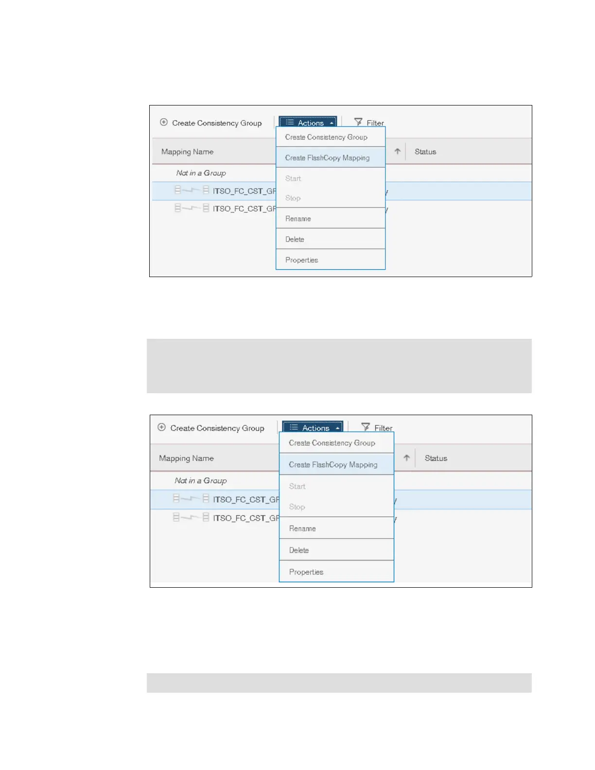 3. If you select a new Consistency Group, click Actions → Create FlashCopy Mapping, as