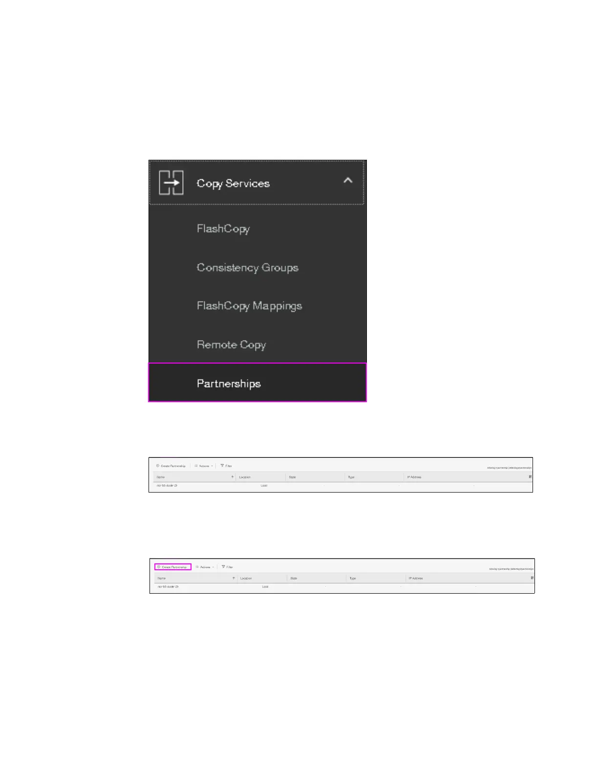 1. From the main navigation pane, click Copy Services → Partnerships as shown in