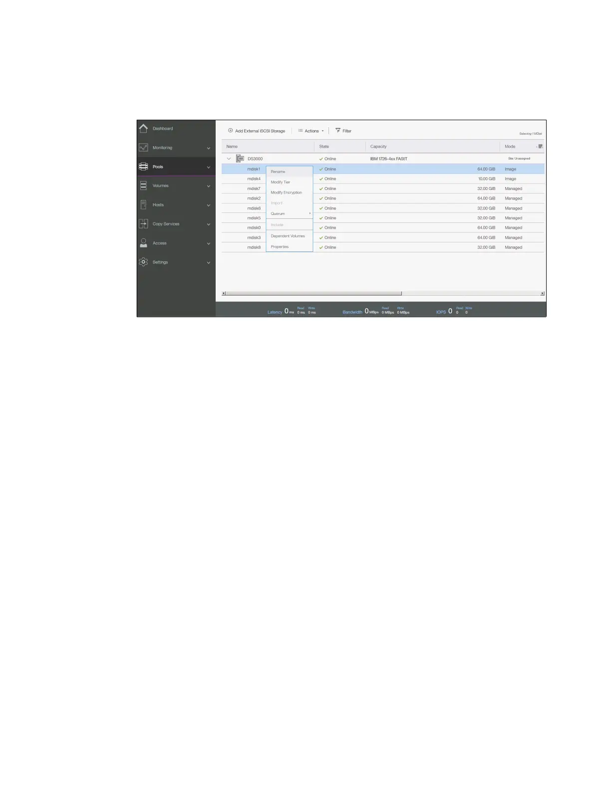 8. In the External Storage panel you can also right-click an MDisk (or use the Actions