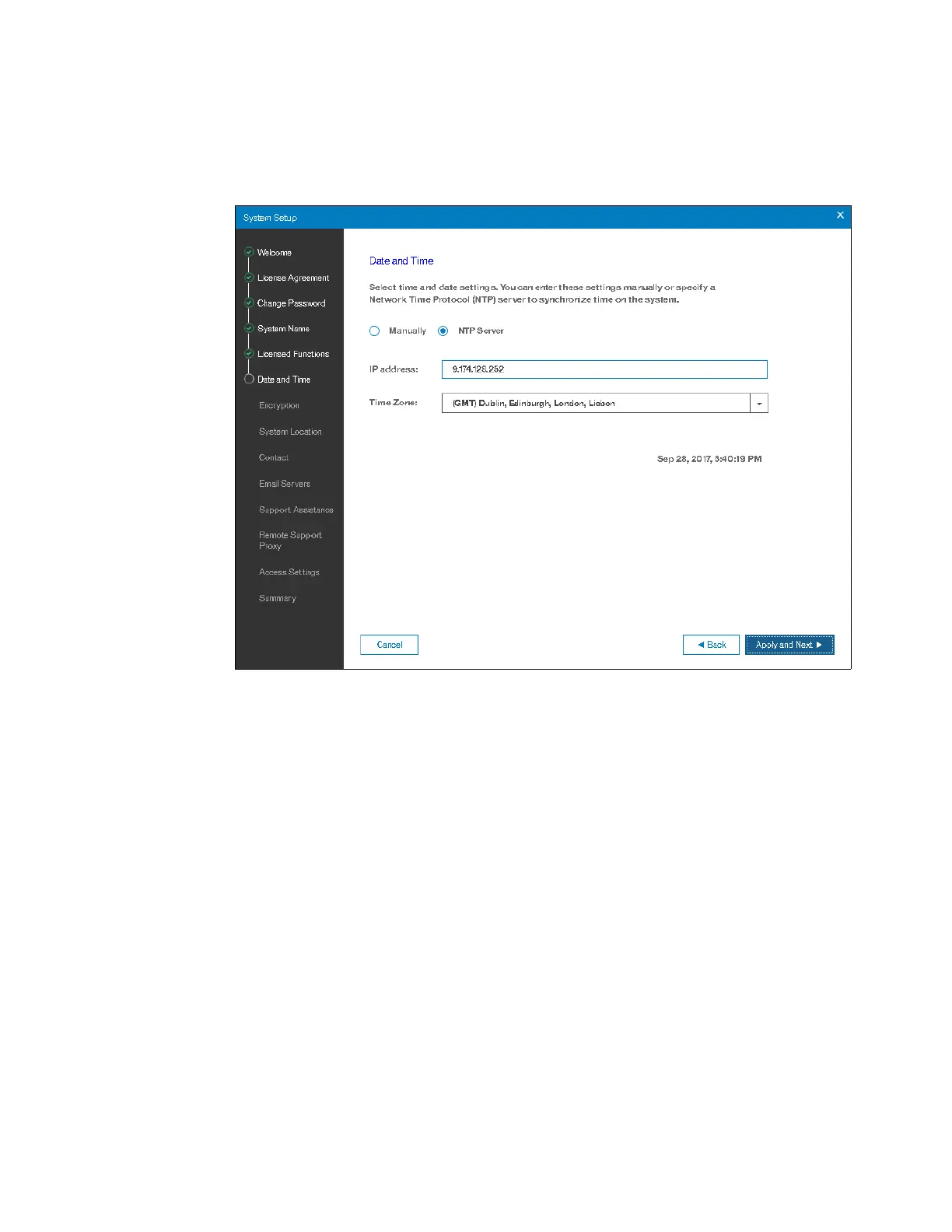 Protocol (NTP) server. After this selection, the Apply and Next option becomes active, as